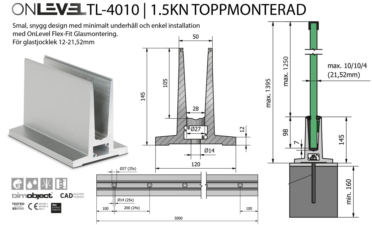Glasräcken / Helglasräcke topp / TL-4010 1,0 kN