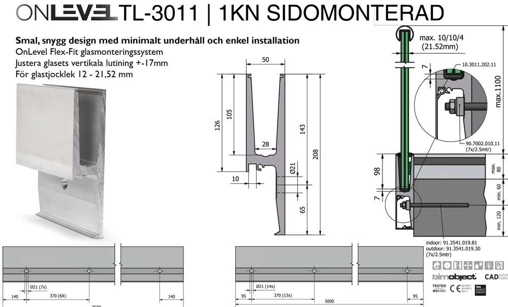 Tunn, snygg design med minimalt underhåll. Finns även att få lackad i egen RAL färg. Justerbart glasmonteringssystem +-17mm. Enkel montering och skarvning av profilen med stift OnLevel Flex-Fit glasmonteringssystem för glastjocklek 12 - 21.52 mm3011 Profil Alu-finish 5000mm