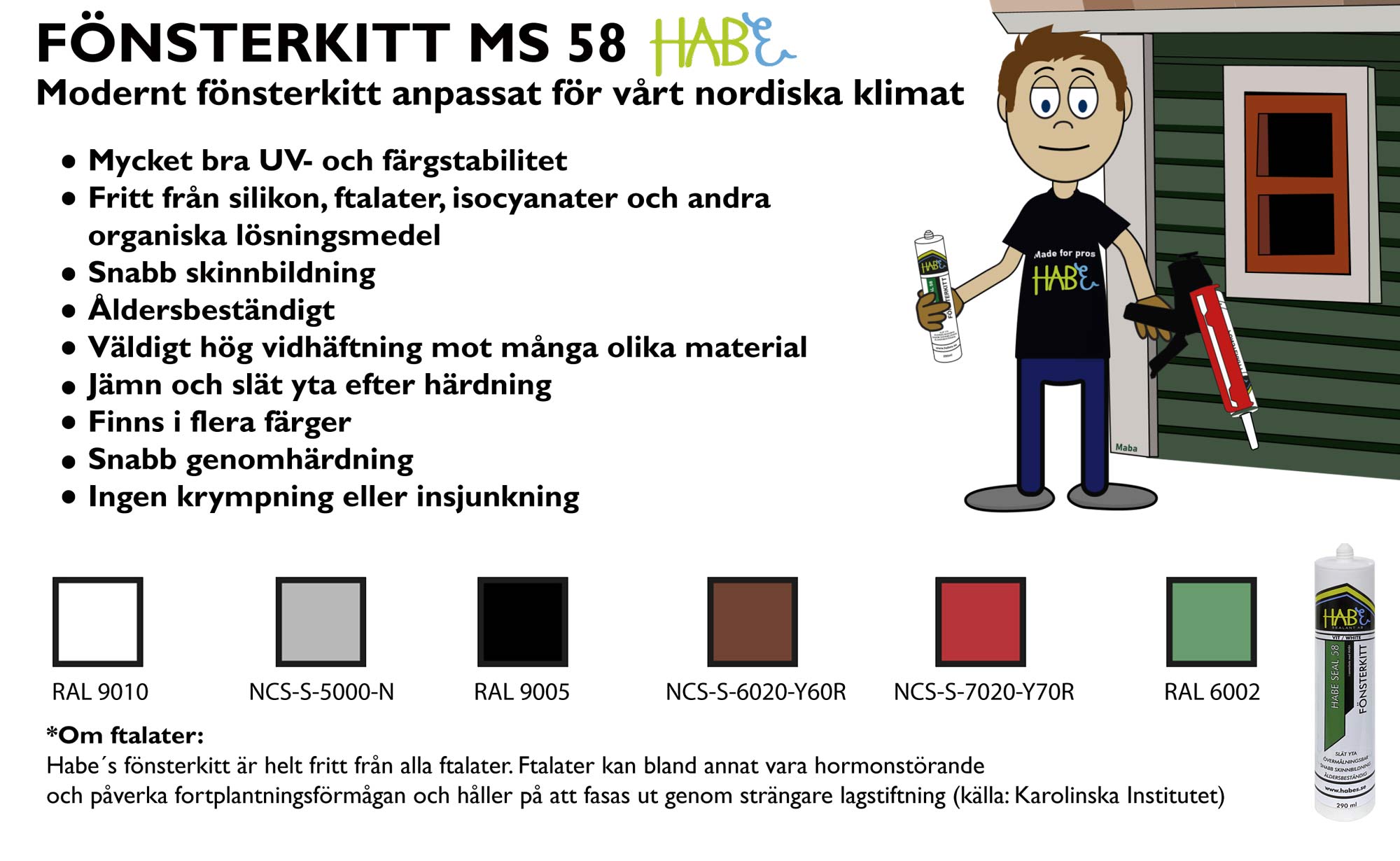 Modernt fönsterkitt anpassat för vårt nordiska klimat. MS-bas med perfekt konsistens och tillverkat med en teknik som gör att det bibehåller sin form och inte sjunker ihop vid härdning. Övermålningsbart med de flesta förekommande akryl- och alkydfärger på marknaden. Även linoljefärg! Fönsterkitt MS 58 är naturligtvis fritt från ftalater*, isocyanater och andra organiska lösningsmedel. Klimatsmart! Produceras i Sverige utan långväga transporter! Mycket bra UV- och färgstabilitet Fritt från silikon, ftalater, isocyanater och andra organiska lösningsmedel Snabb skinnbildning Åldersbeständigt Väldigt hög vidhäftning mot många olika material Jämn och slät yta efter härdning Finns i flera färger Snabb genomhärdning Ingen krympning eller insjunkning 10 års funktionsgaranti *Ftalater kan bland annat verka hormonstörande och påverka fortplantningsförmågan och håller på att fasas ut av strängare lagstiftning (källa: Karolinska Institutet).