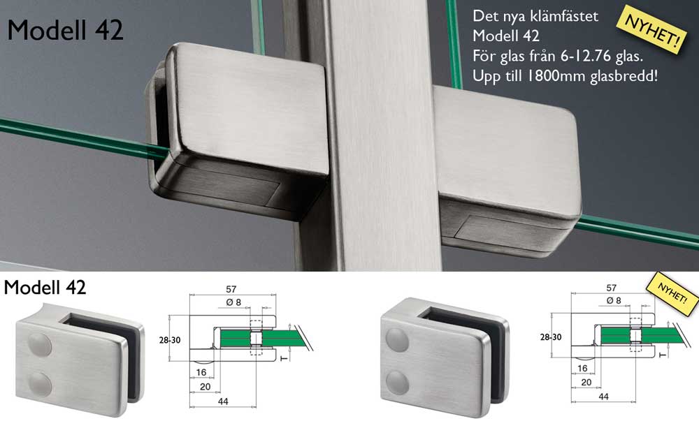 För rundrör 42,4mm. Längd 57, bredd 30, höjd 45mm. För 8-12.76mm glas. Underplatta ingår Utförsäljning, gummi finns kvar för 6,76 - 8 - 8,38 - 10 - 10,76 - 12Art nr: 14424212