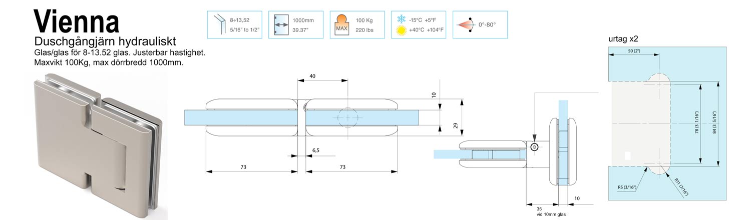 För 8-13.52mm glas. Maxvikt 100Kg, Max dörrbredd 1000mm. Rostfri finish