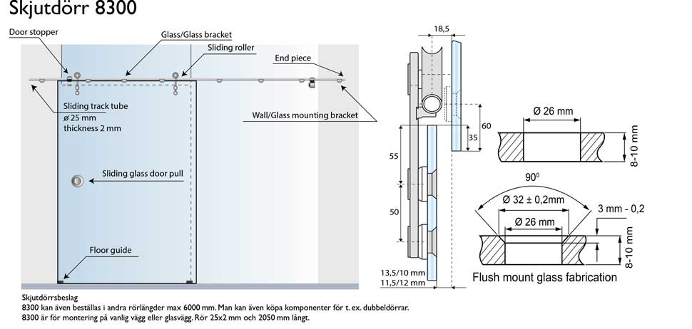 Beslagssats i rostfritt stål 304 för 8-10mm glas. Maxvikt 120kg. Innehåller: 1 rör 2050mm (kapbar), 2 vagnar, 2 dörrstopp, 1 golvstyrning. Godkänd för dusch. Välj till väggfäste eller glasfäste beroende på underlag (åtgår 5st/2000mm).Beslagssats